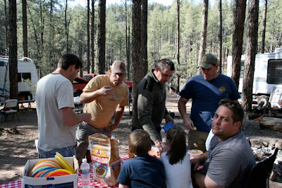 We enjoyed watching conference in the mountains so much last October that we decided to go for round two last weekend. We camped just 13 miles east of Payson so it was a nice quick drive, but the ride home was a completely different story. The B-line was closed at the Bush Hwy turn off, so the back up was horrendous!!! It took us two hours to go about 30 miles - totally ridiculous. Despite the long ride home, the runny noses and coughs the boys developed, the sunburns, overeating, excessive dirt, and my nephew falling in the fire pit and being rushed to Payson ER - it was a great trip. The boys had so much fun getting filthy dirty, riding the quads, and playing with their cousins.